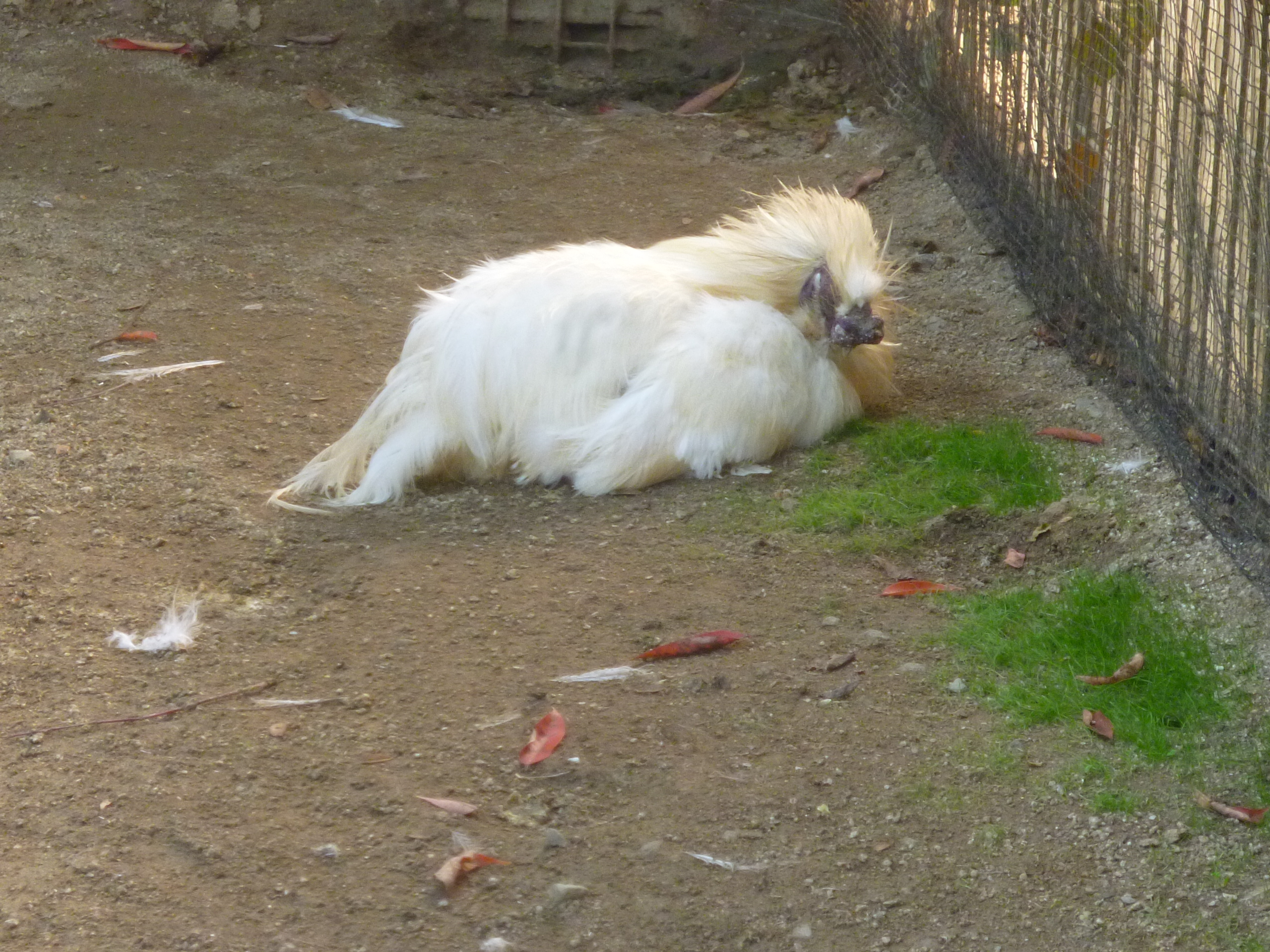 和歌山城・動物園の烏骨鶏が座って身繕いをしているところです。立っている時はチョット強いイメージがありますが、座って身繕いをしている姿は可愛い感じでした。