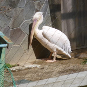 和歌山城・動物園のペリカンです。体が大きいのでバランスをくずした? イイエ、違います。単に耳の後ろを足の指で掻いているだけです。