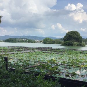 和歌山電鐵貴志川線の、甘露寺前駅南に広がる、平池はいつ作られたか、わかっていません。古代に古墳が作られてから後、貴志の谷を大きく開発するため、この広大な池を作り、古墳が残されたのでしょう。池中の島は古墳です。向こう岸のこんもりした森も古墳で、さらに左側にも古墳があるようです。こちら岸の土手にも前方後円墳がありますが、墳丘が削られ、なだらかなキーホール型が残っています。